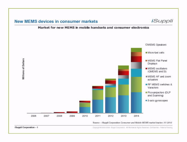 隨著今年優於預期的景氣復甦力道,iSuppli公司MEMS的分析師Jérémie Bouchaud已經調升了他對於MEMS今年營收成長的預期為19%_20%,達到70億美元的市場規模。他指出,反彈力道在汽車市場上創造出大量需求,讓整條供應鏈上各家廠商的庫存再度被填滿,並促使汽車MEMS元件的整體增長幅度達到27%,而有些供應商的成長更高達40%。另外,隨著平板式的產品已成為前五大消費電子商品,攜帶式微型投影機(Picoprojectors)、iPhone 4和iPad這些新興產品也帶動了對MEMS的強大需求。