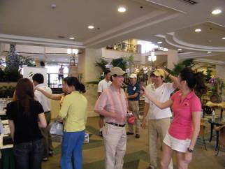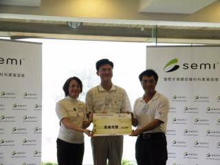 賽事約於10:30結束,大夥陸續梳洗完畢並休憩片刻後,即一同共享午餐。待用餐暫告一段落,活動主持人SEMI台灣協理何玫玲,邀請兩球隊的會長--旭德科技總經理陳黃正、漢民科技副總經理林淑玲上台致詞,會中並特別感謝中微半導體贊助一萬元現金提供此次球賽獎品,以及漢民科技贊助一萬元現金作為團隊優勝獎金,而台灣百和工業亦贊助提供每位球友們精美的小禮物。另外,為響應全民救災88水患的捐款,SEMI台灣暨東南亞區總裁曹世綸亦代表雙方球隊,拋磚引玉共同捐贈了一萬元予中華民國紅十字會。